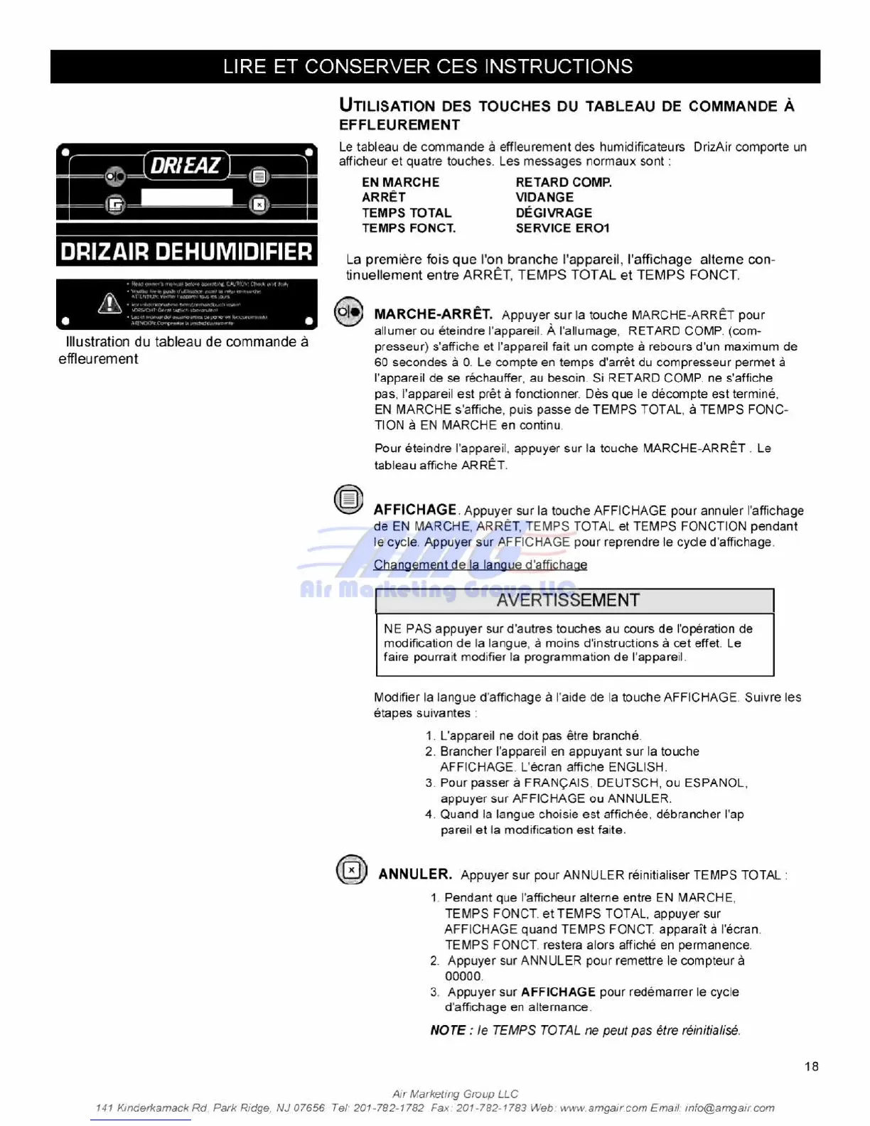 Le tableau de commande a effleurement des hurnidificateurs DrizAir cornporte un
