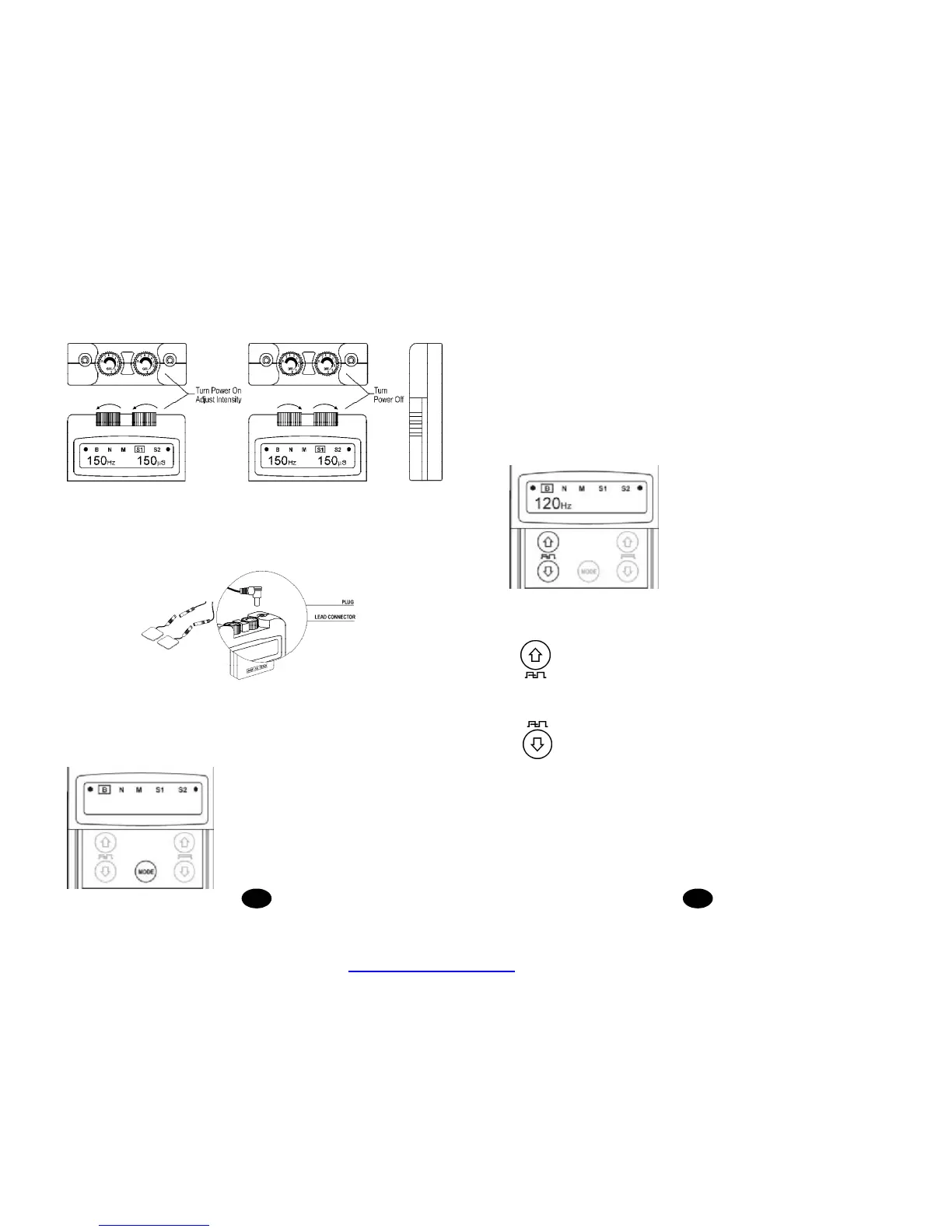 controlling 5 modes: B for burst stimulation, N for constant stimulation, and M for