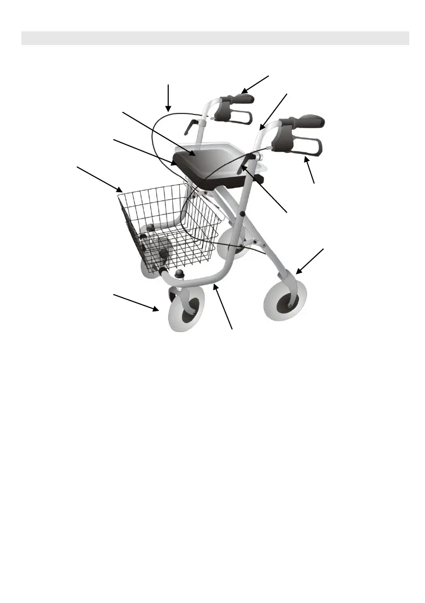 Drive Migo - Teile des Rollator - Parts of walking device; Handgriff - Handgrip; Schiebegriff - Adjustable tube of handgrips; Bremse - Brake