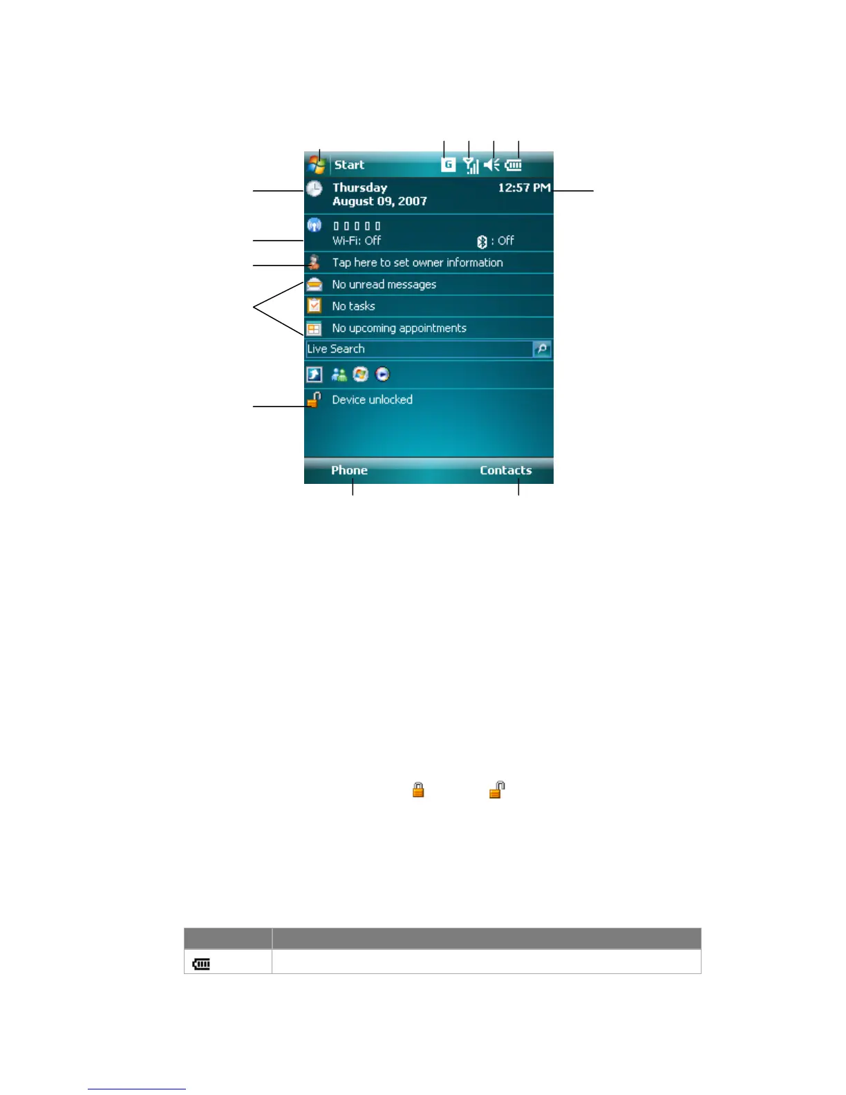 3 Indicates the radio signal strength. Tap to configuration the phone settings.