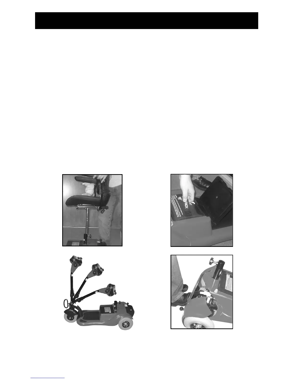 1. Switch the scooter off, unscrew the seat knob and remove pin. Pull up on seat to