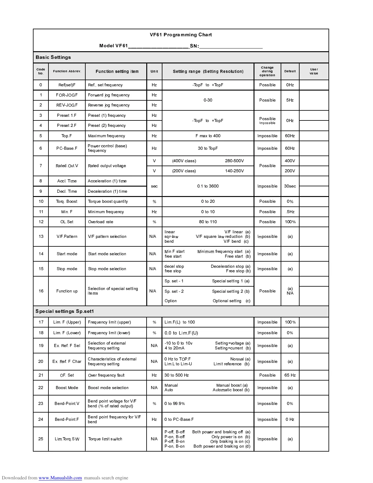 7.5 VF61 Programming Chart