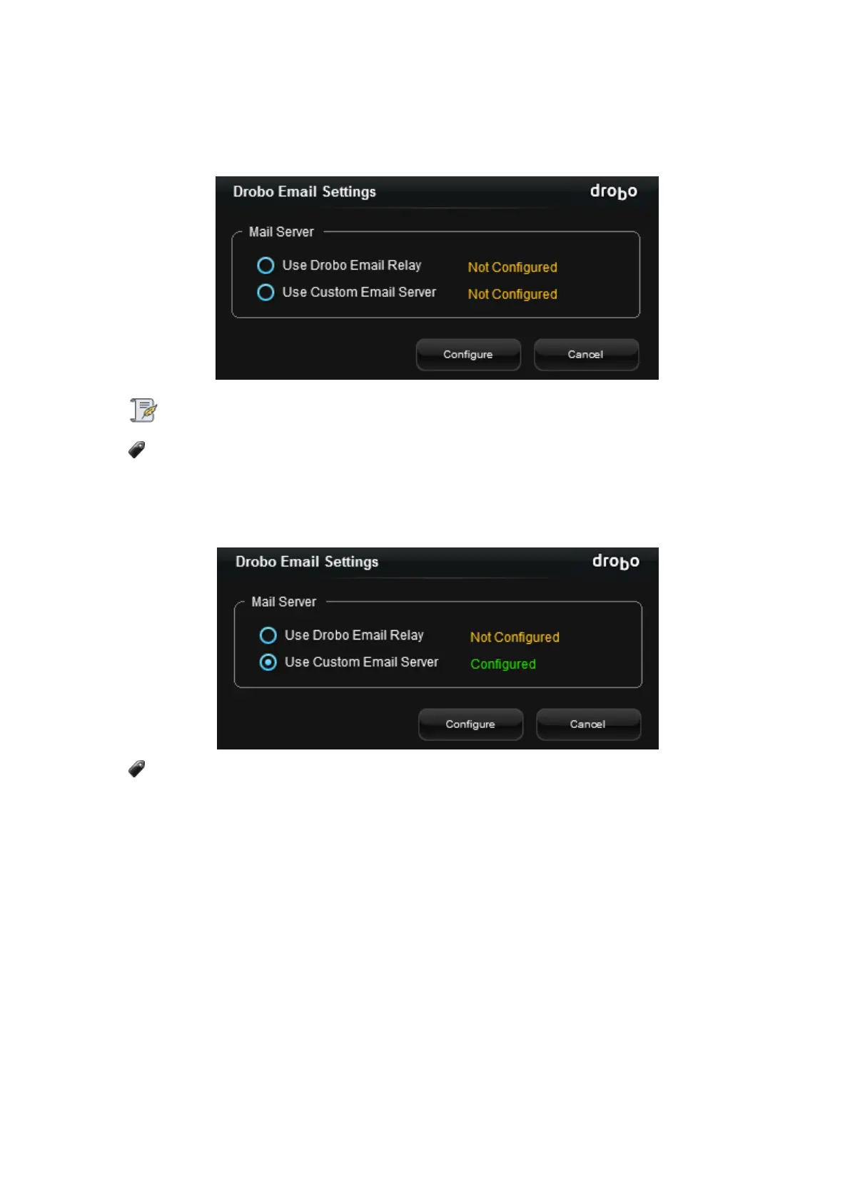 3. Drobo email settings can be configured using one of the two options, Use Drobo