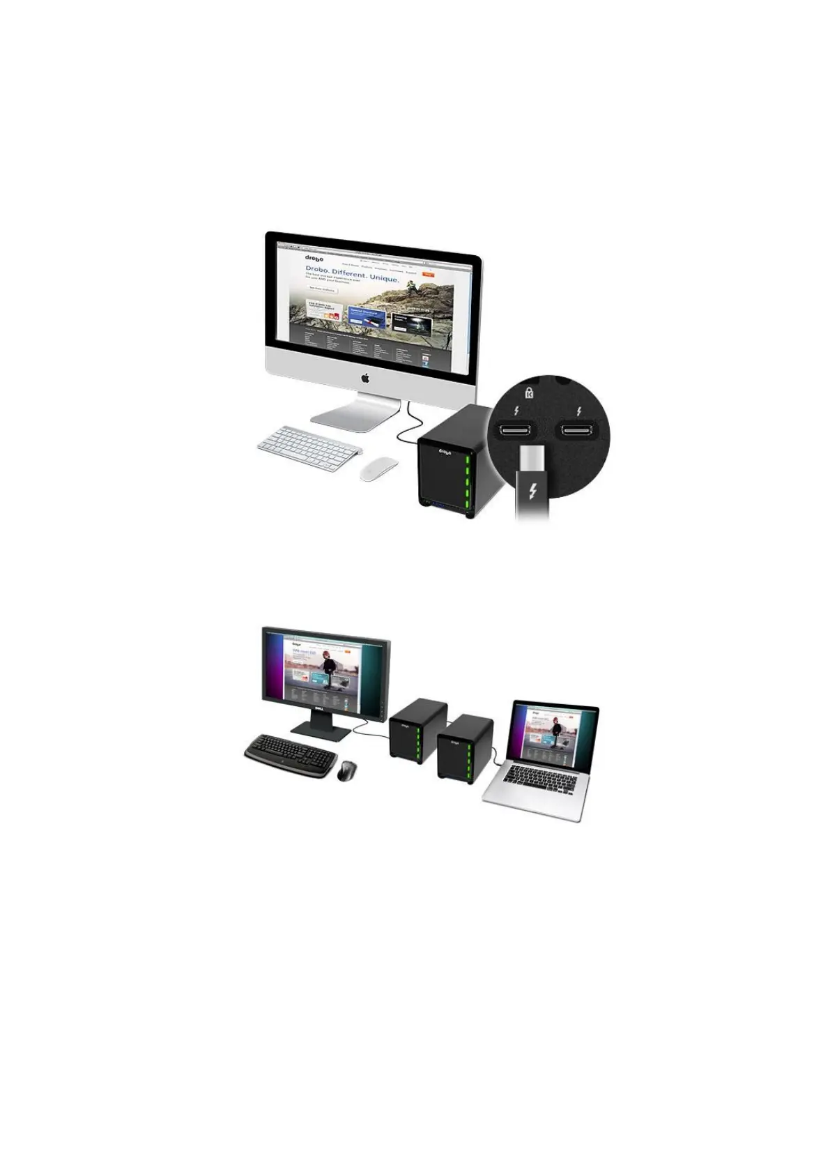 There are three options for connecting your Drobo device using its Thunderbolt