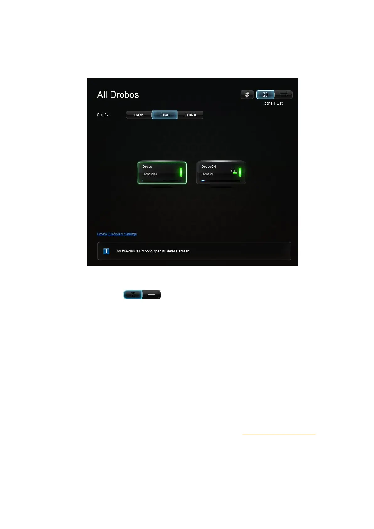 ● View by Icon– This button provides a view of the connected Drobo devices