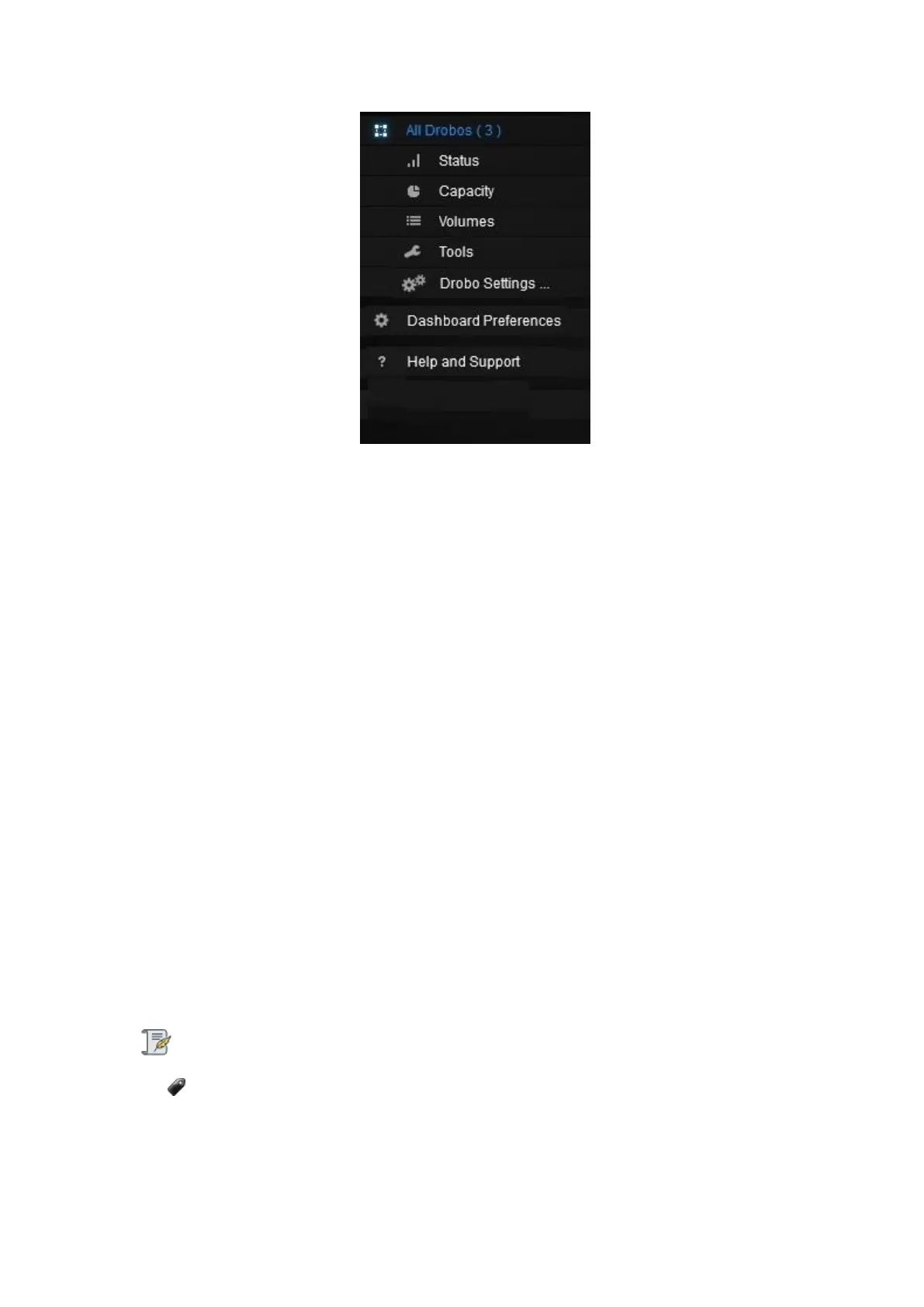 ● Drobo Settings – Opens a sub-menu with the option to modify various types of