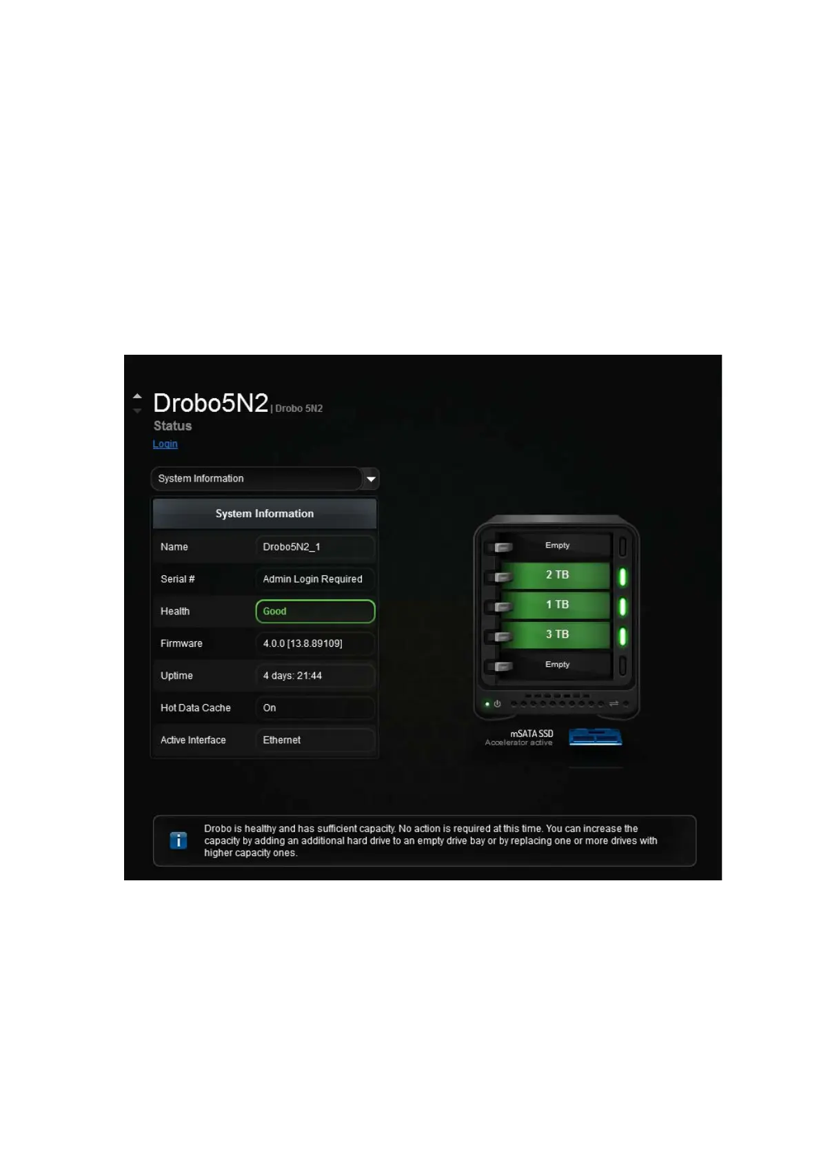 the serial number, firmware version and health of the Drobo 5N2. If you use SSDs, their positions are