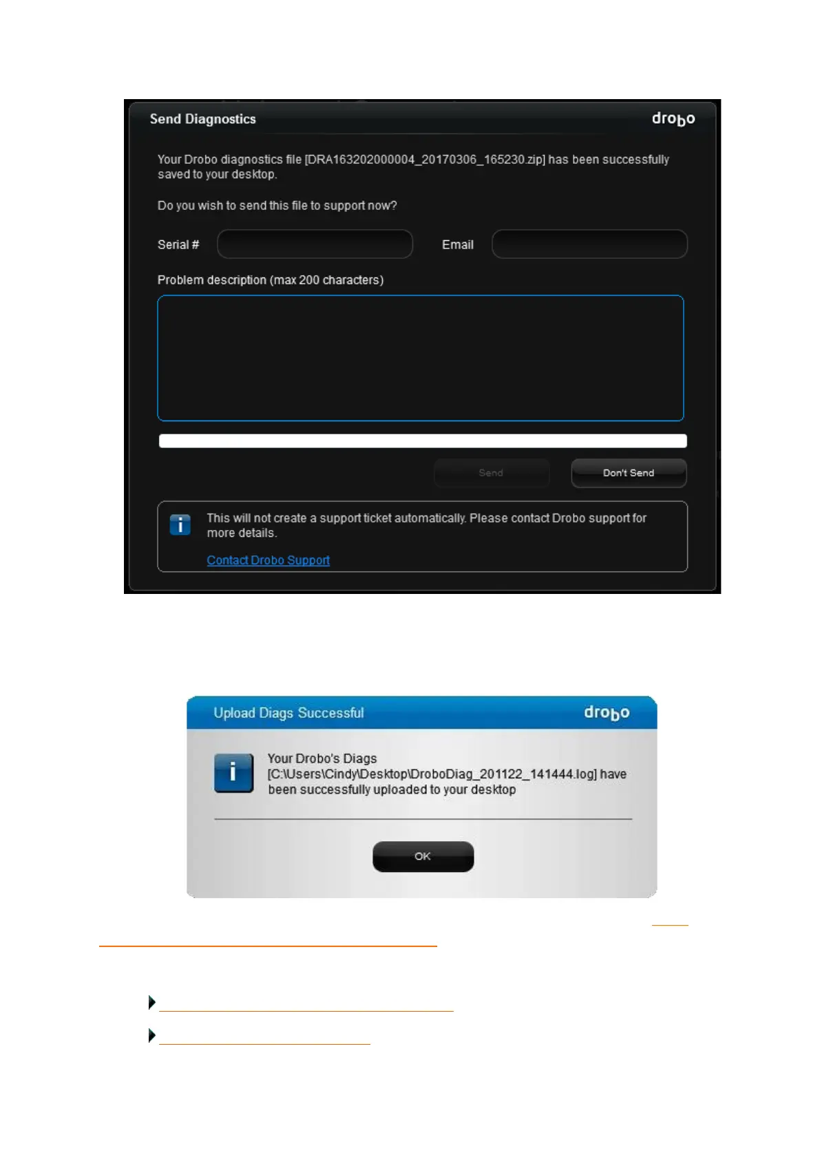 If you cannot generate a diagnostics file because your Drobo device does not mount, see: What