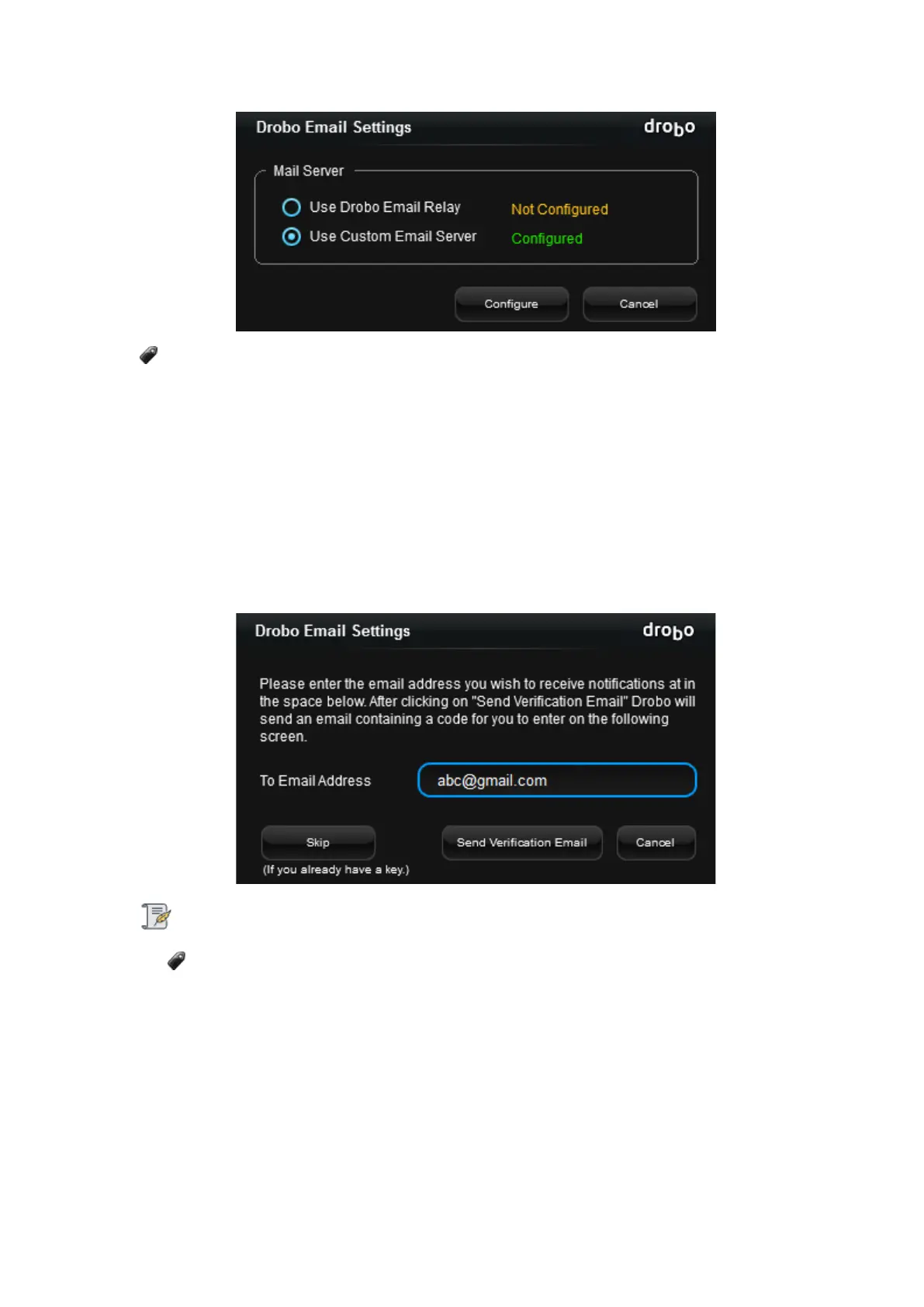 1. Select the Use Drobo Email Relay radio button and click Configure.