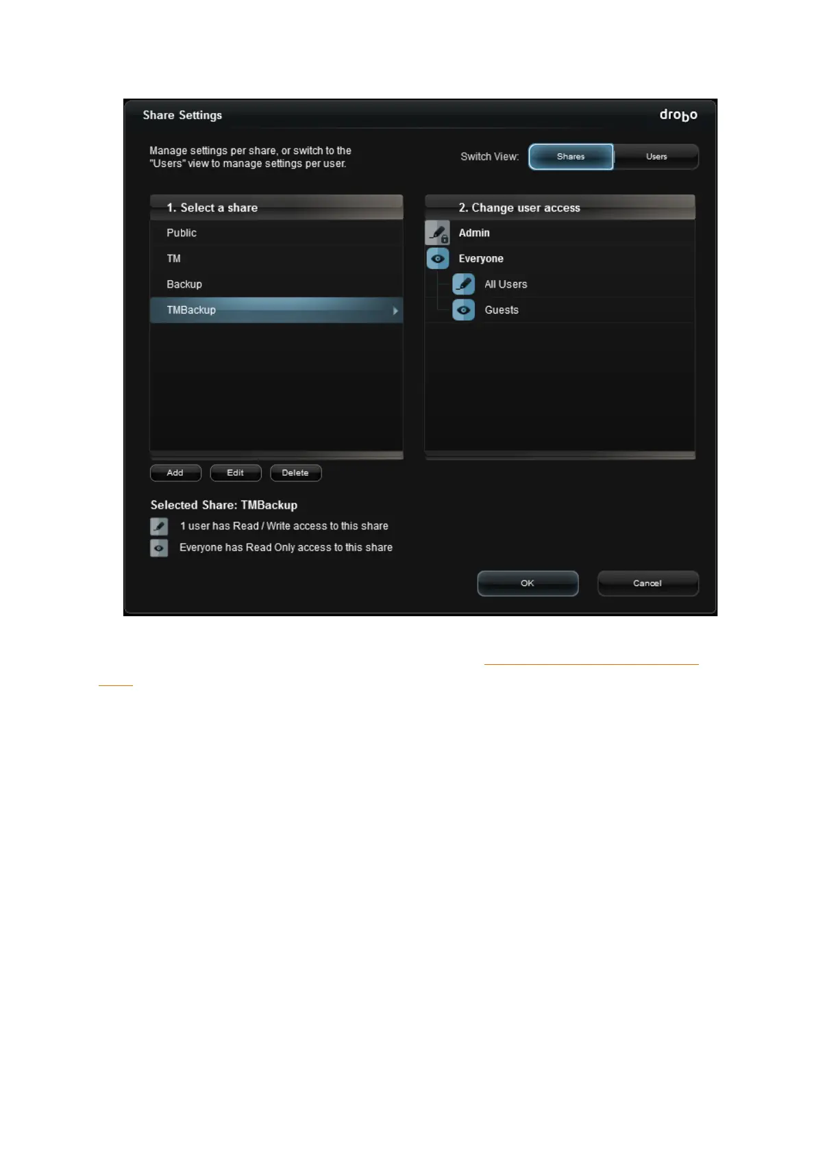 10. Click OK after assigning the rights. The Shares page will appear. Mount the Backup by selecting
