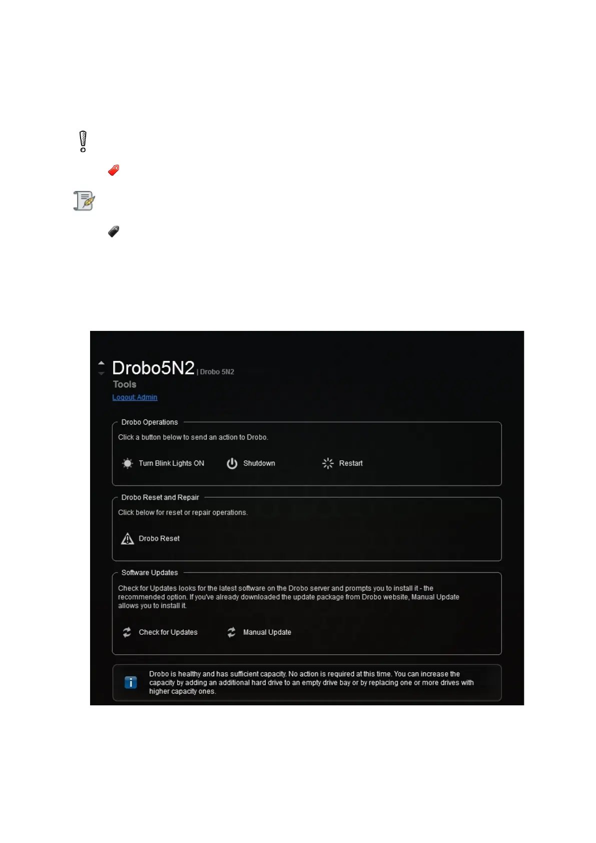 reset, and then click the Tools option from the Navigation menu. The Tools page for that Drobo