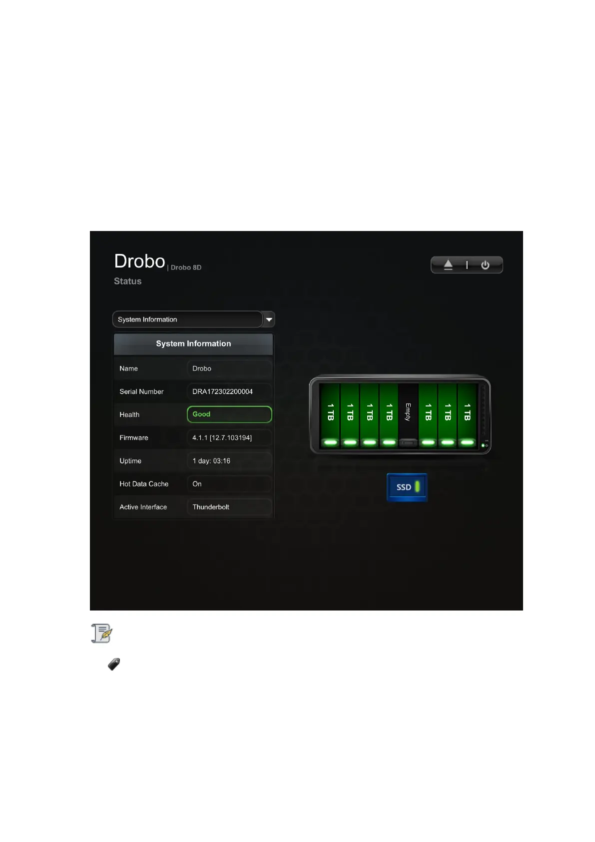 You can check for the Drobo 8D’s serial number from the Status page of Drobo Dashboard.