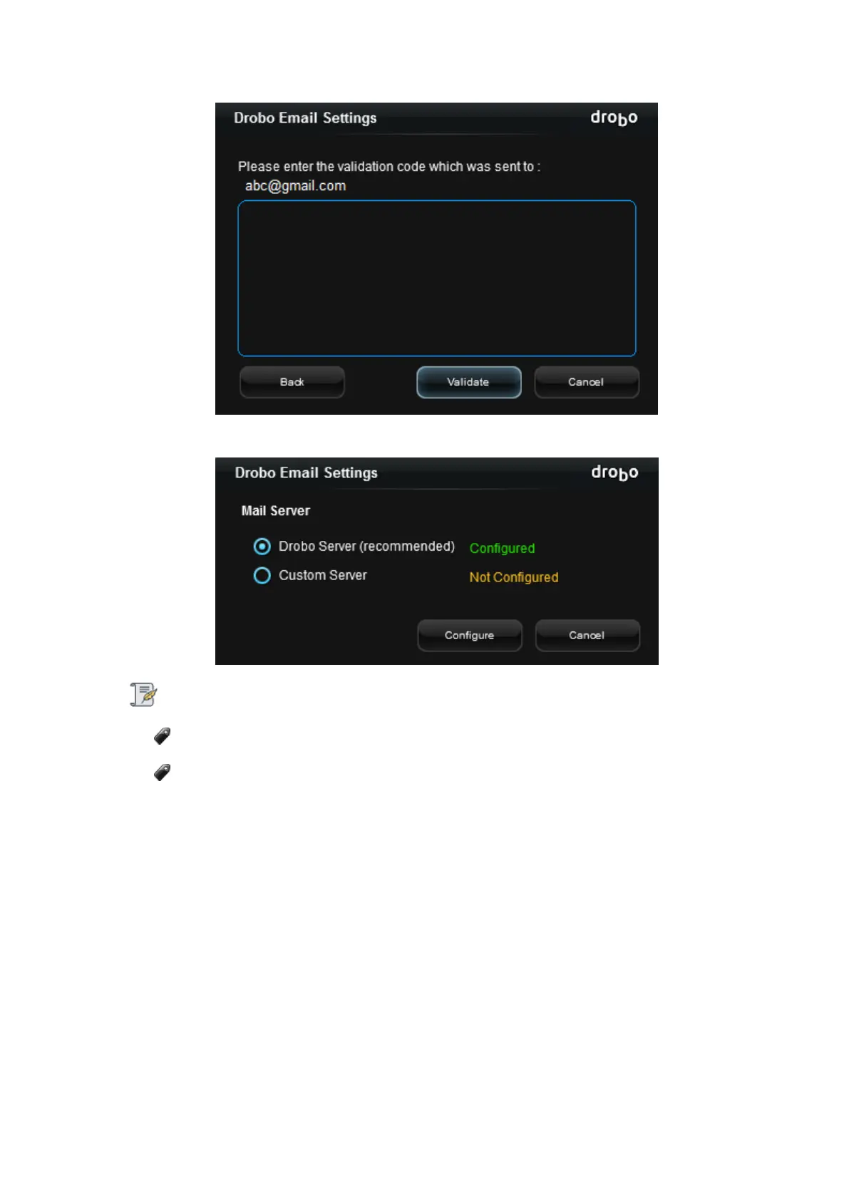 5. If successfully configured, the the Drobo Email settings page will show Drobo Server configured.