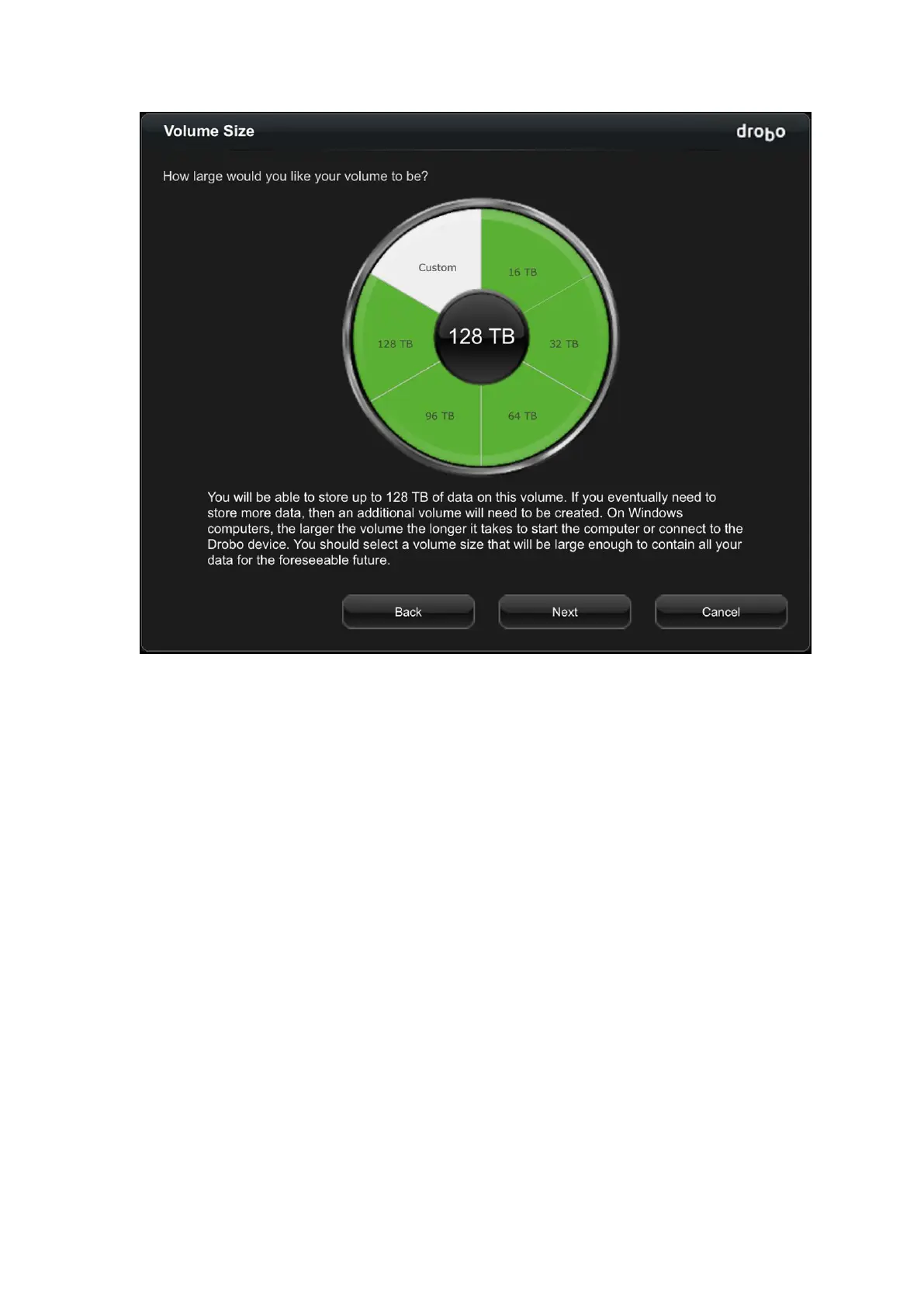 6. Select appropriate size and click Next button. The Volume Name page opens