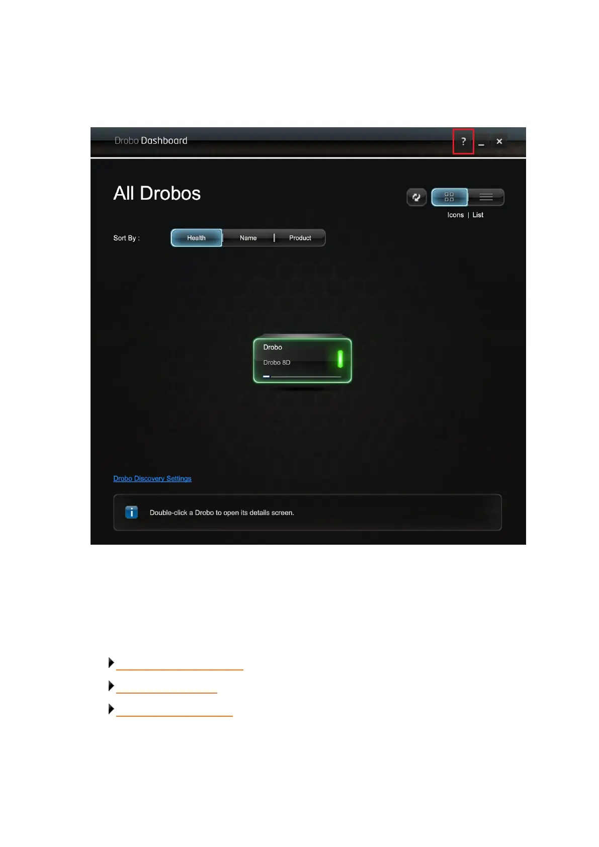 On the top right corner of the Drobo Dashboard, you will find the Help button (?).