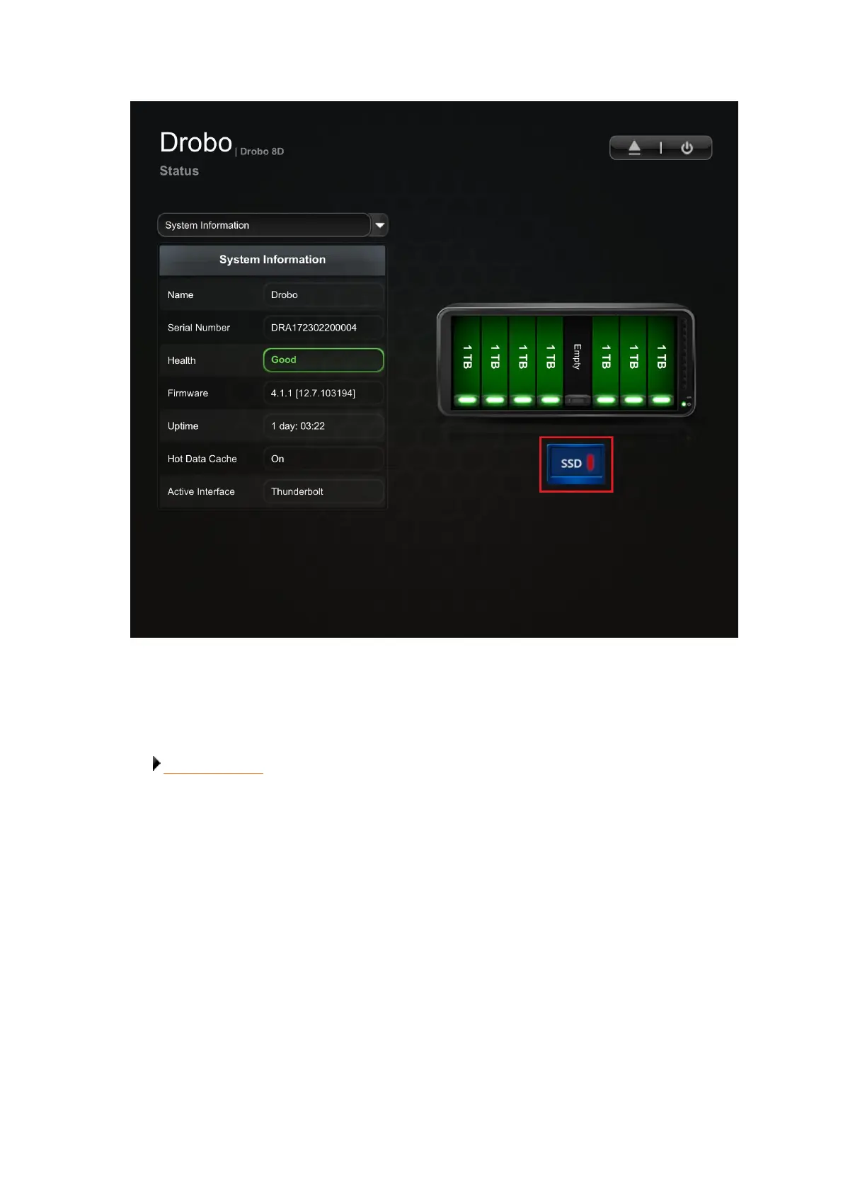 Figure 2: Status page of Drobo 8D indicating Failed SSD