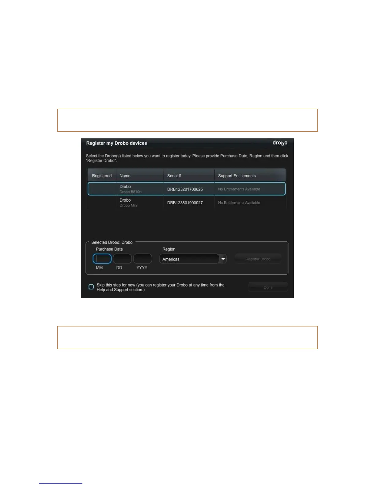 6. Select Drobo B810n and enter its purchase date. Then, select the region from where you