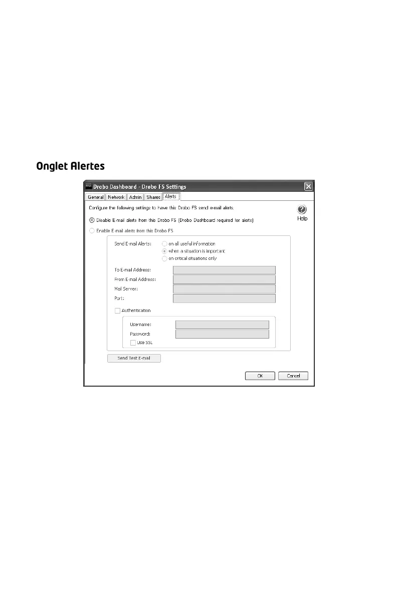 Drobo Dashboard peut également envoyer des alertes par e-mail selon