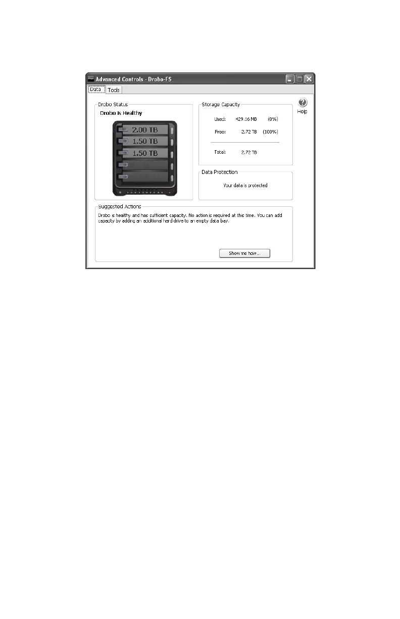 [高度な制御] [データ] タブで、Drobo FS のステータスの詳細が