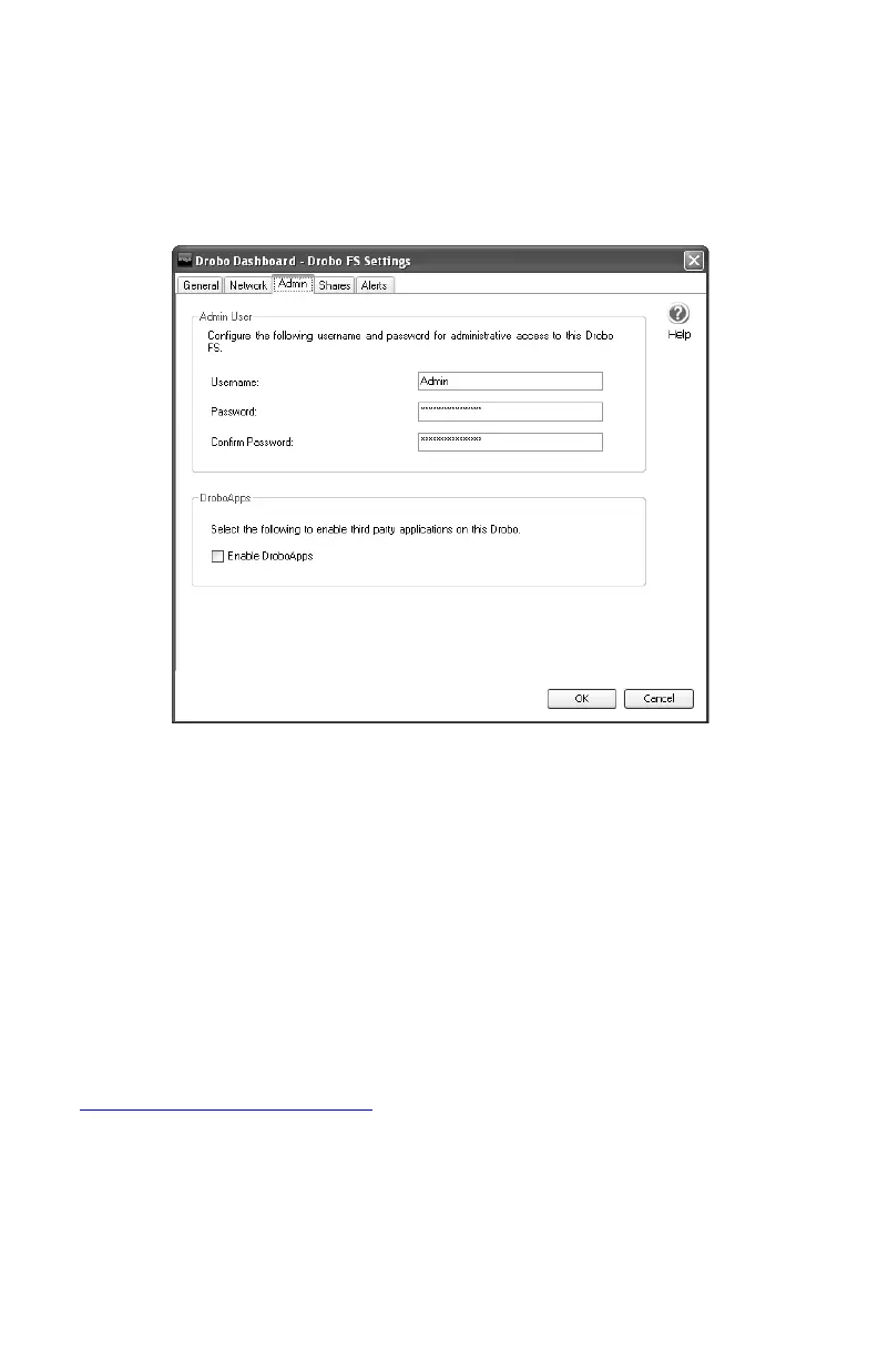 この画面は、Drobo FS の管理用のユーザー名とパスワードの割り