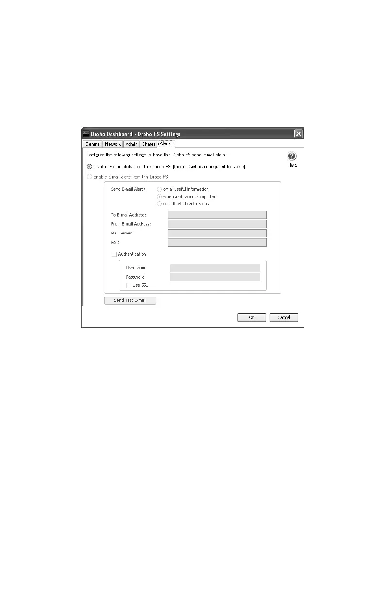このタブでは、Drobo FS からの直接電子メールアラートを有効に