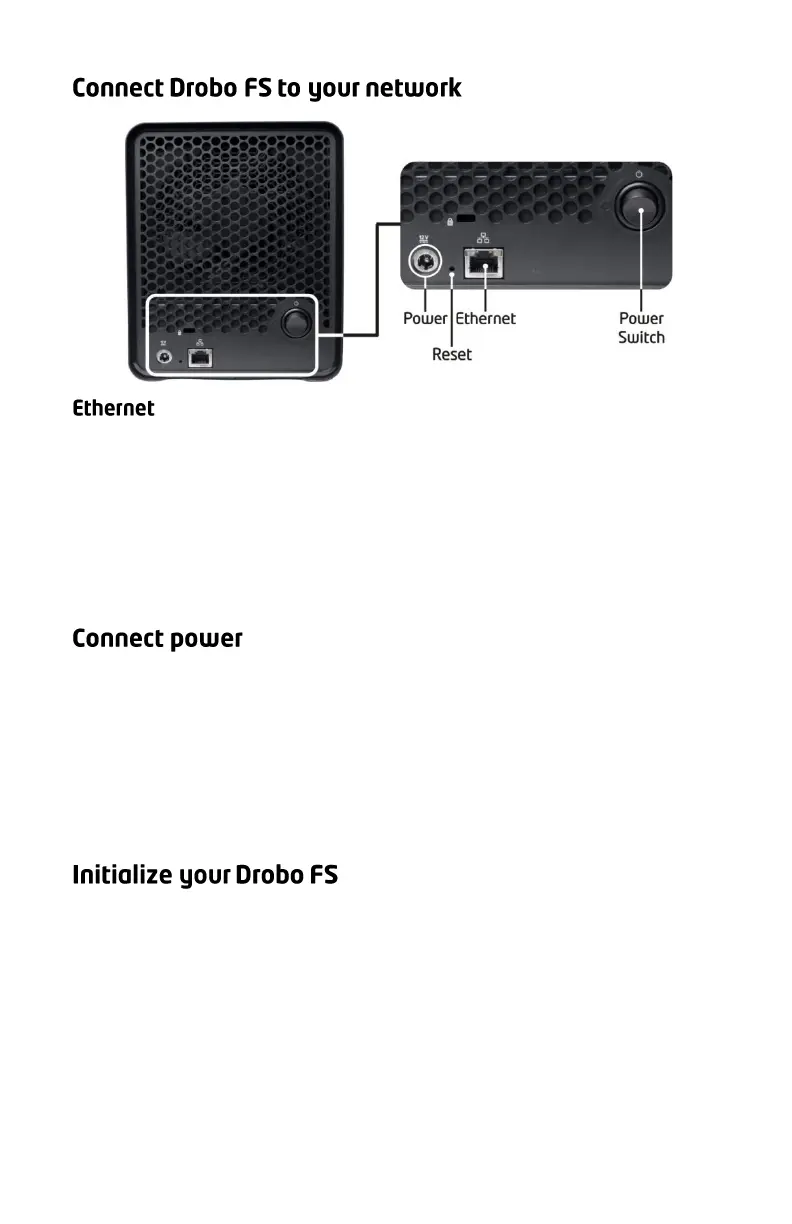 Your Drobo FS connects to a network using an Ethernet port. Use the