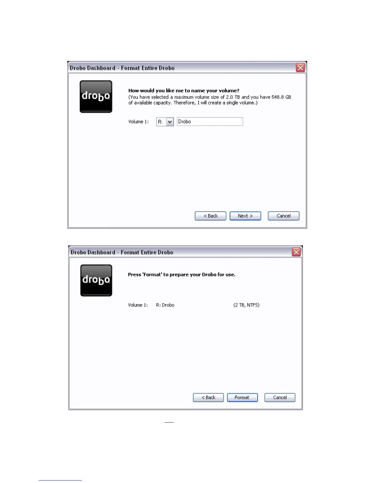 4. Depending on your volume selection and the total raw capacity of the drives in Drobo, you will be presented