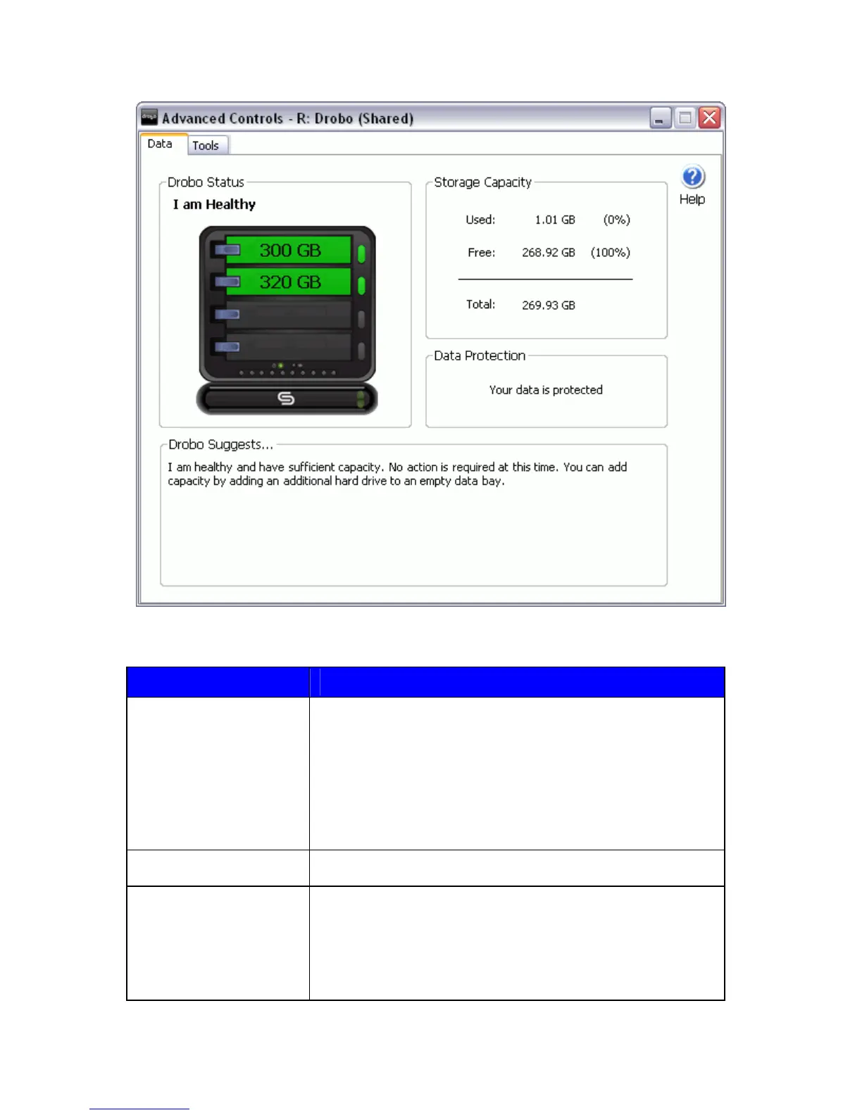 Status The status window provides an at-a-glance view of your Drobo or Drobo and