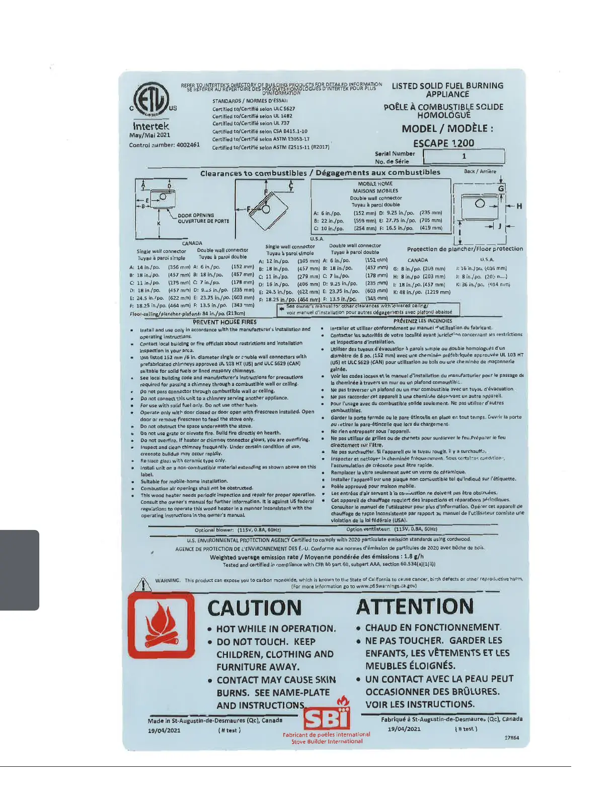 Drolet ESCAPE 1200 - 1. CERTIFICATION PLATE
