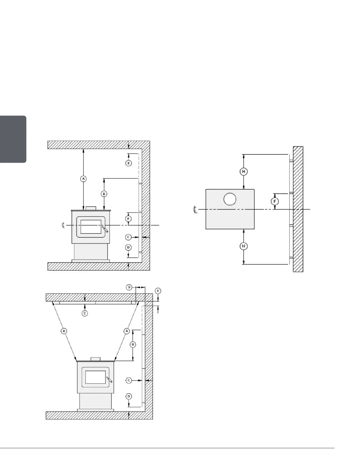 G) Edge clearance for ceiling shields to side and back walls: 3" (75 mm).