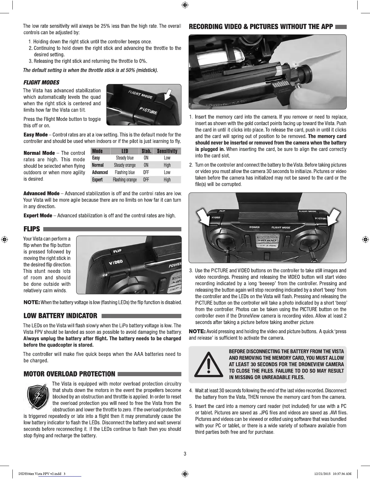 Dromida VISTA FPV - FLIGHT MODES; FLIPS; LOW BATTERY INDICATOR; MOTOR OVERLOAD PROTECTION