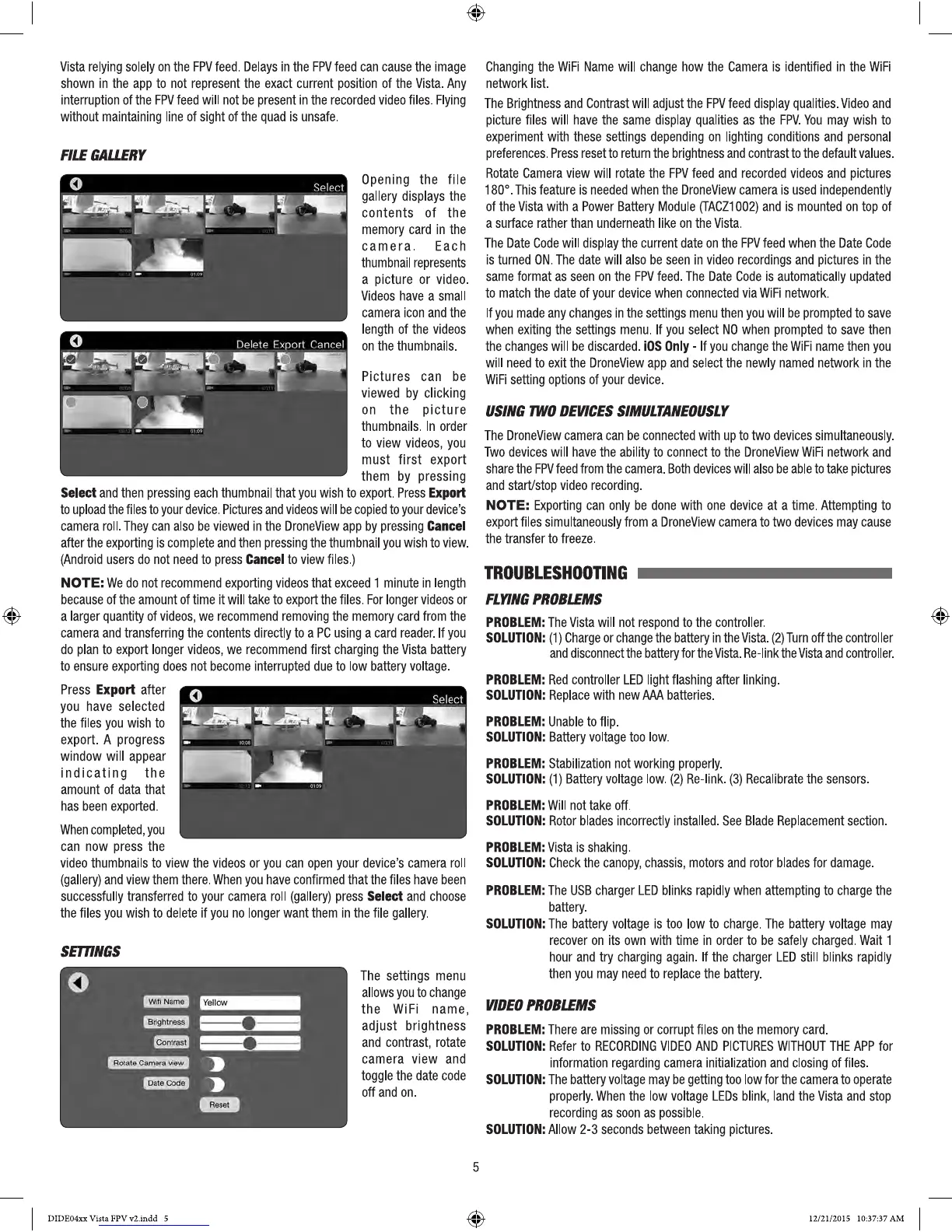 Dromida VISTA FPV - FILE GALLERY; SETTINGS; TROUBLESHOOTING; FLYING PROBLEMS
