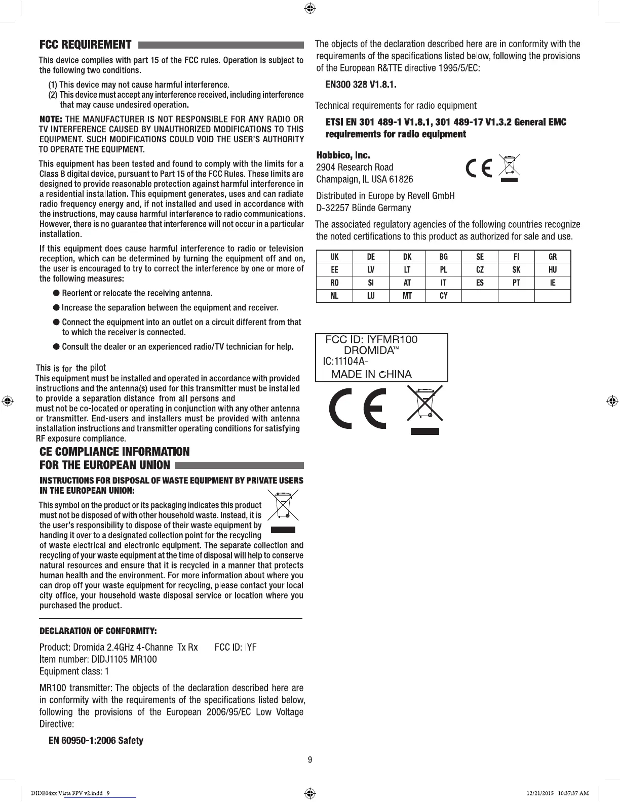 Dromida VISTA FPV - FCC REQUIREMENT; CE COMPLIANCE INFORMATION