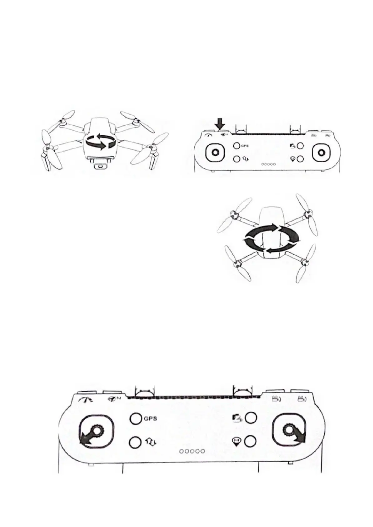 button then press the drone as shown below, and rotate it horizontally about 3 times. On the remote control once the