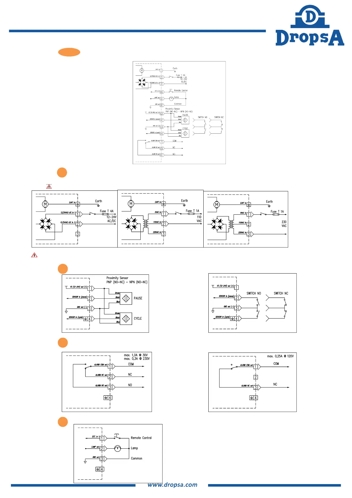 DROPSA BRAVO - Wiring Diagrams; Power Supply Wiring; Cycle Sensor Wiring; Minimum Level Wiring