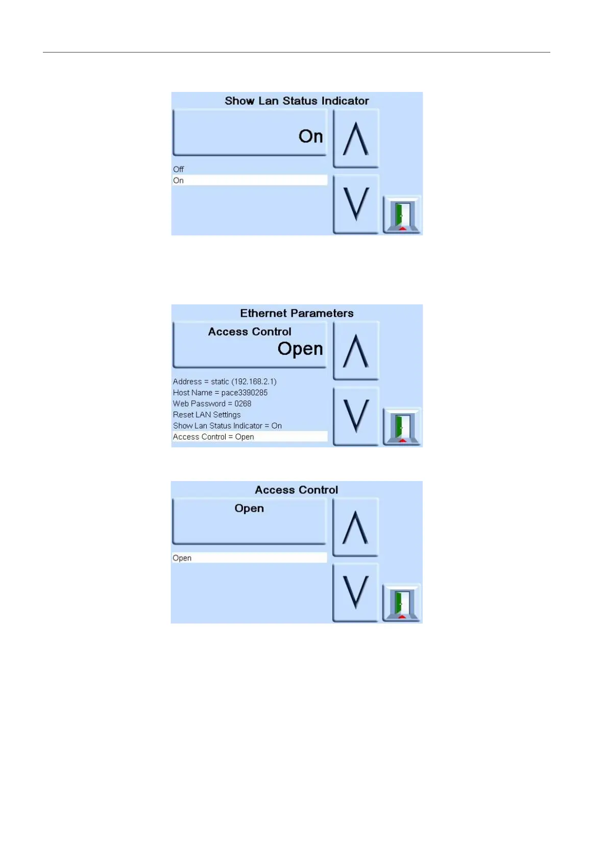 a. On the ETHERNET PARAMETER screen, use the UP and DOWN arrows on the right