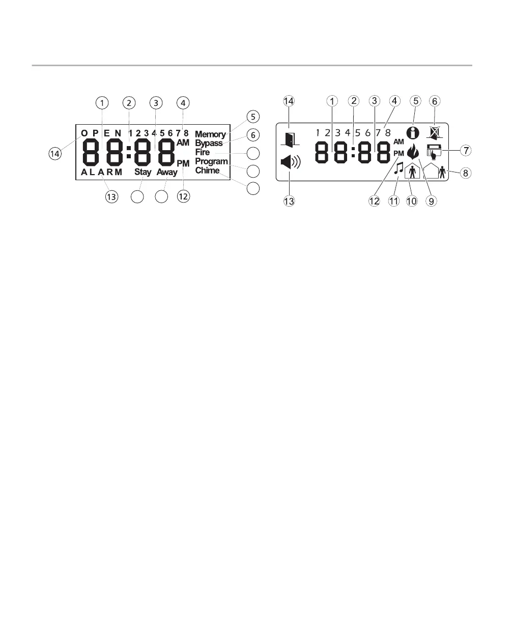 13 ALARM – This icon is used with clock digits 1 and 2 to indicate zones in alarm on the system. When a zone is