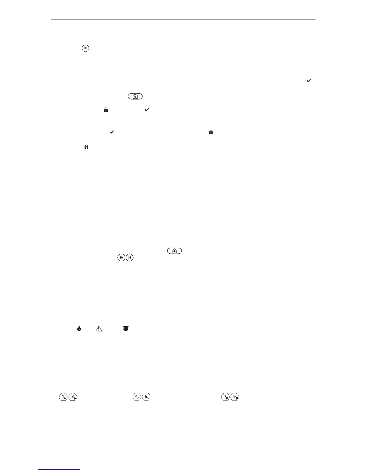 Press the (F), (A) or (P) key for 2 seconds to generate a Fire, Auxiliary or Panic alarm. The