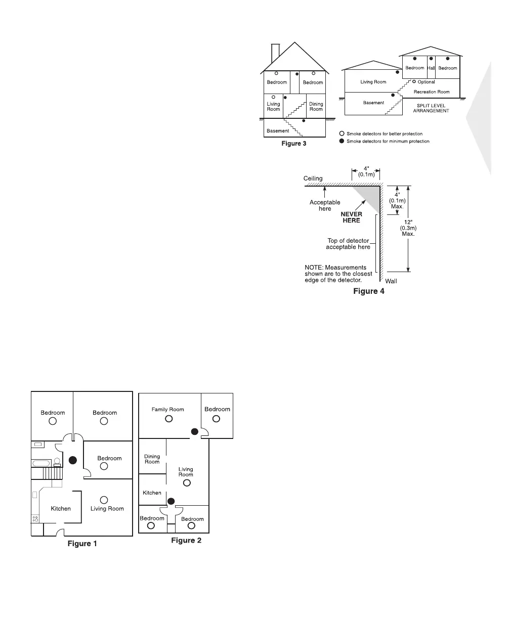 Do not locate smoke detectors at the top of peaked or