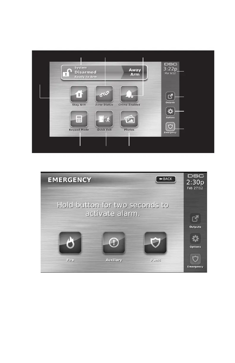 The system status (i.e., Ready, Armed, Exit Delay etc.) is displayed at the top of the screen.