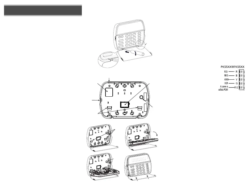 Conecte los cables de Keybus y PGM/Zona al teclado. Coloque el inter-