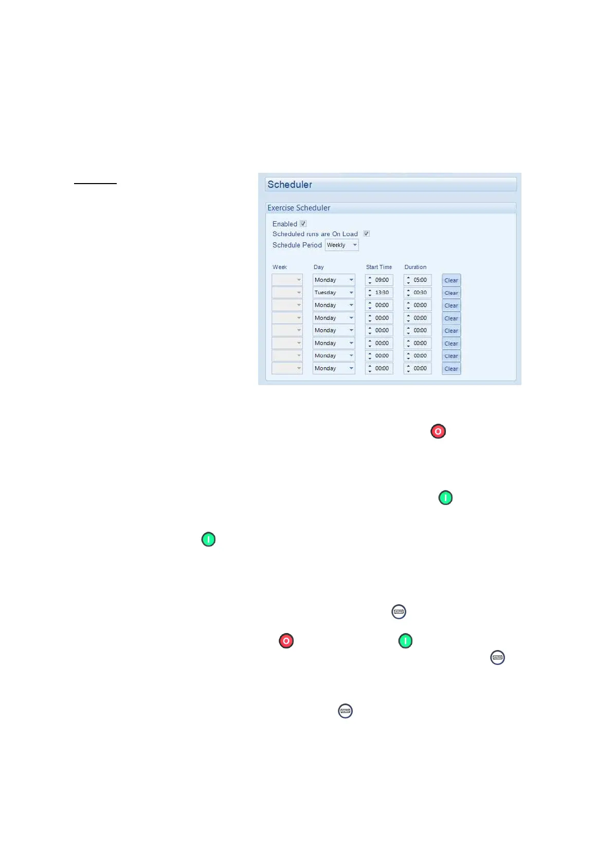 The controller contains an inbuilt exercise run scheduler, capable of automatically starting and