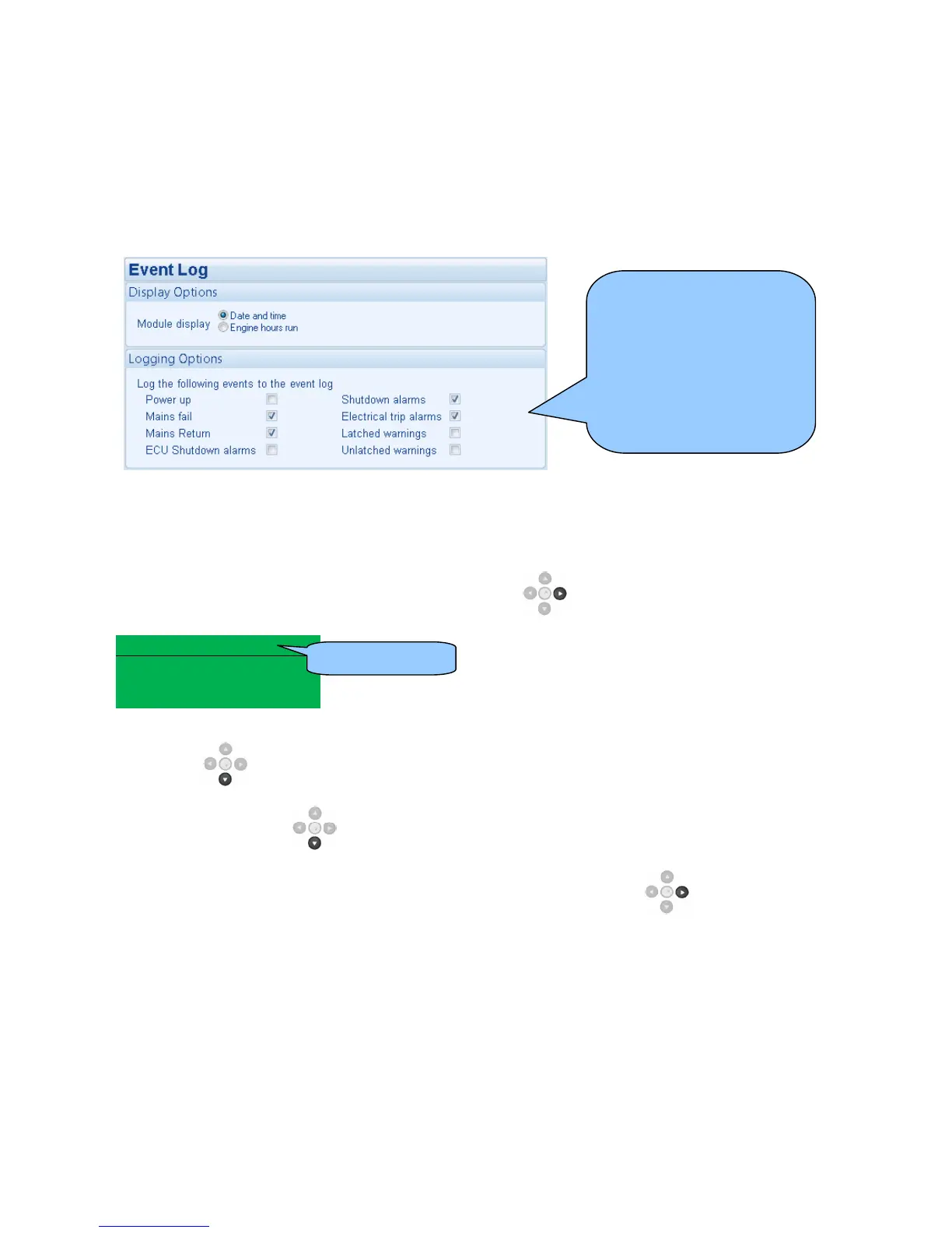 Under default factory settings, the event log only includes shutdown and electrical trip alarms logged (The event