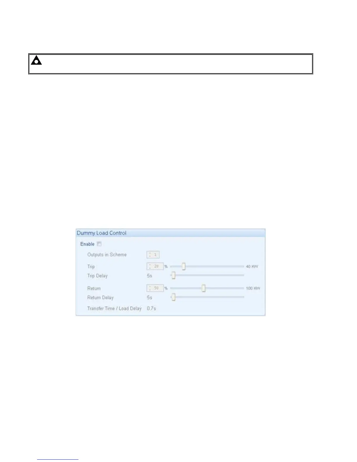 If the generator loading falls below the Dummy Load Control Trip setting (kW), the Dummy Load Control Trip