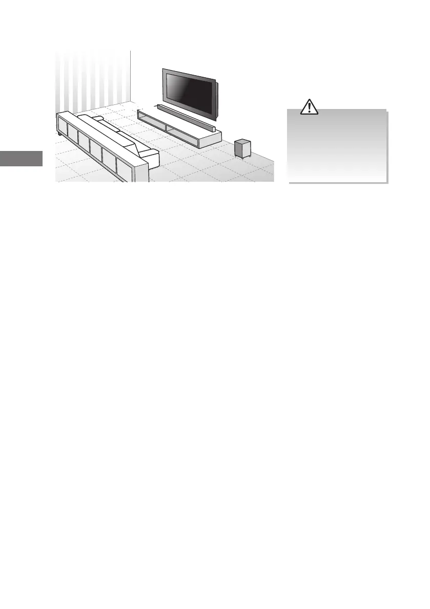 • Subwooferen virker bedst, hvis den er placeret rigtigt i lokalet. Prøv at stille den