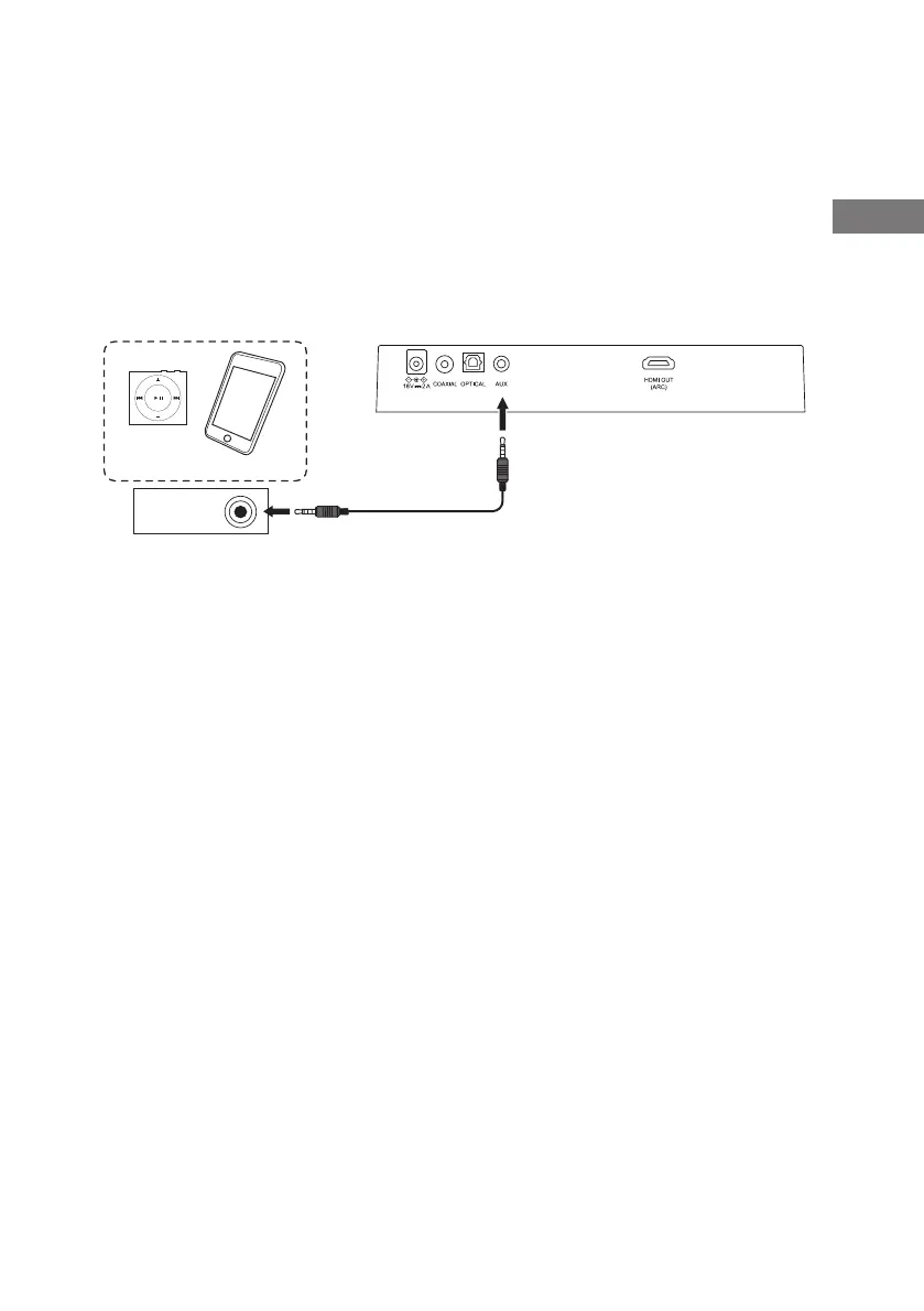 Använd en 3,5mm till 3,5mm stereoljudkabel för att ansluta soundbar-högtalarens AUX-