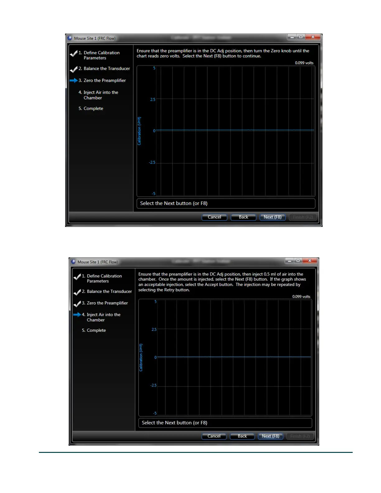 This time, FinePointe wants you to turn the zero knob until the signal is 0 volts. Do so and click Next.