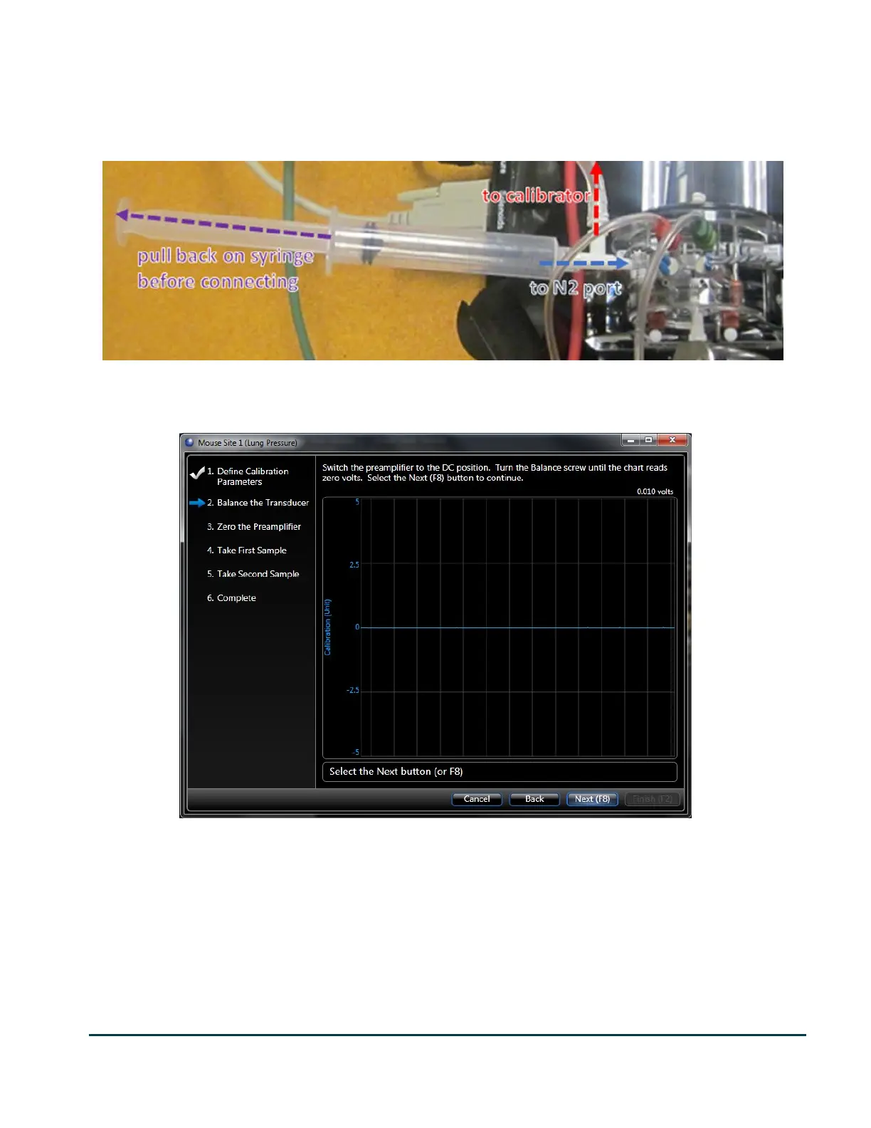 The calibration wizard begins at step 2 “Balance the Transducer”. Turn the Balance screw until the voltage reads