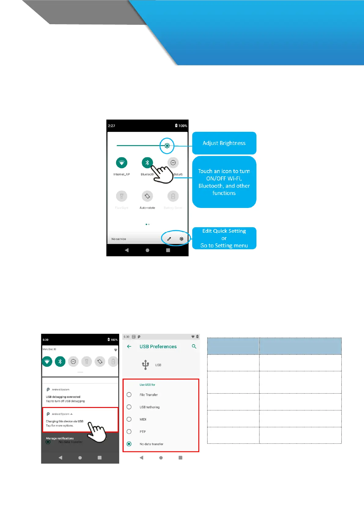 Use Quick Setting to easily access Wi-Fi settings, manage display brightness, open the main Settings menu, and