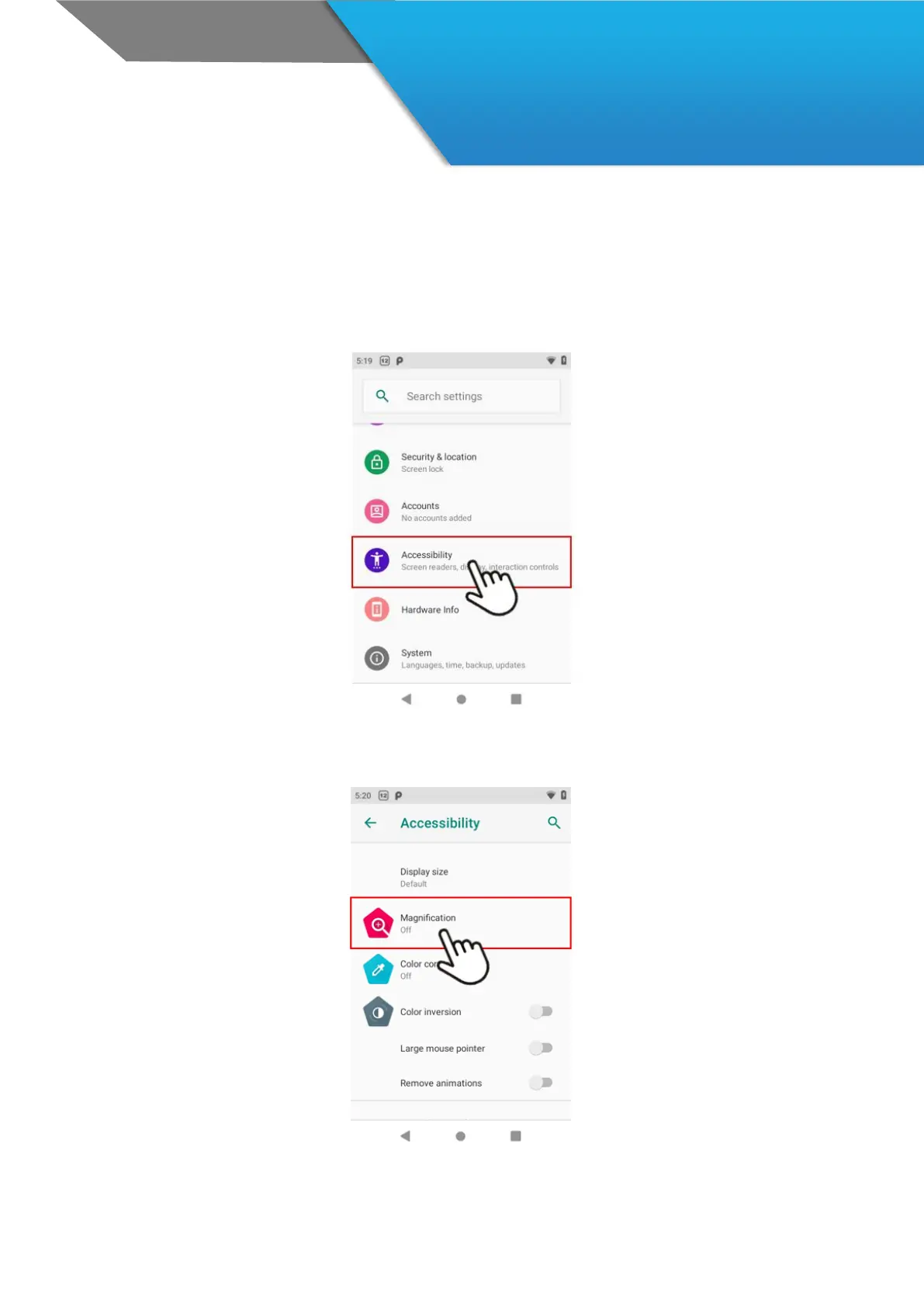 under your finger. To try magnification gestures, go to Settings > Accessibility > Magnification gestures.